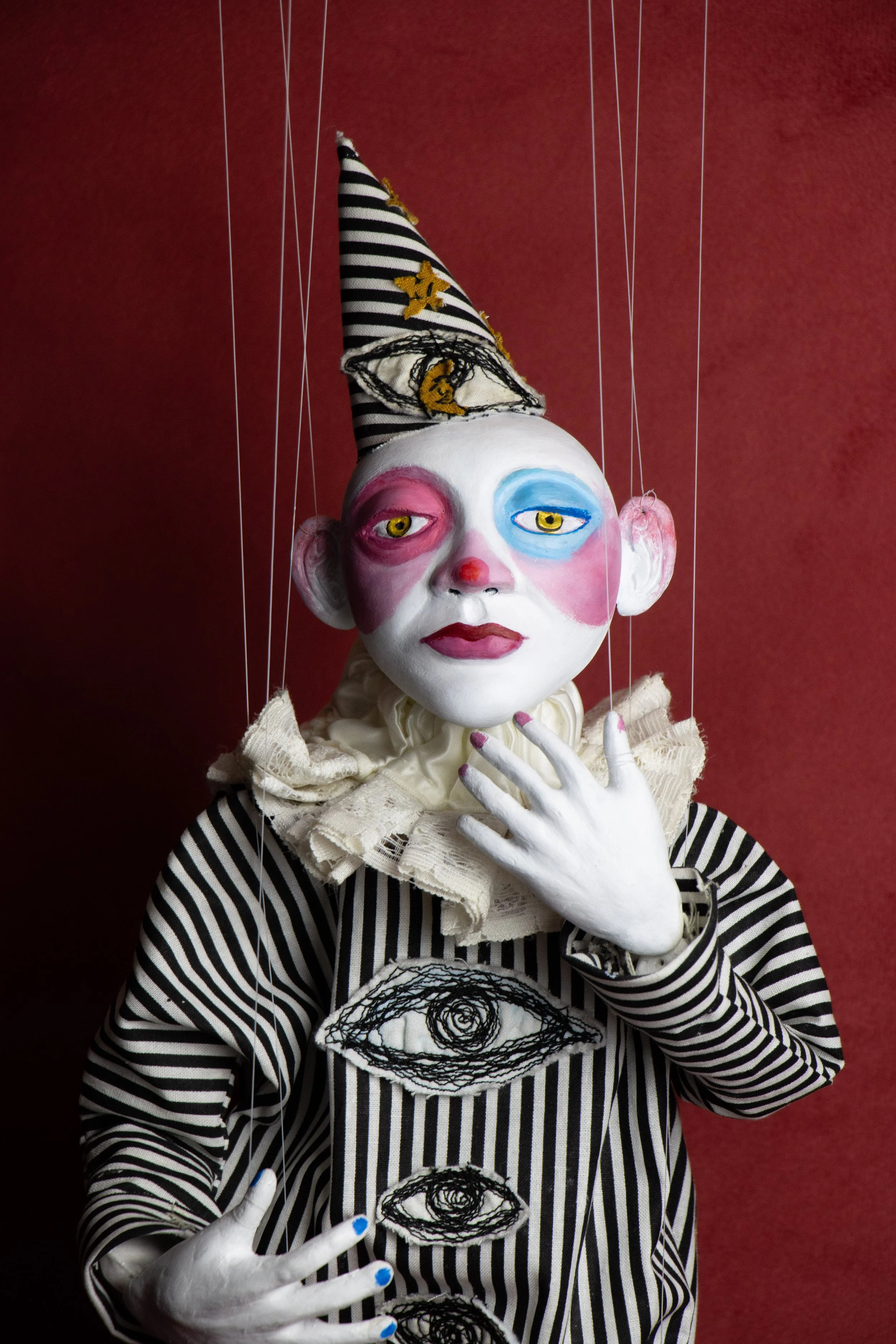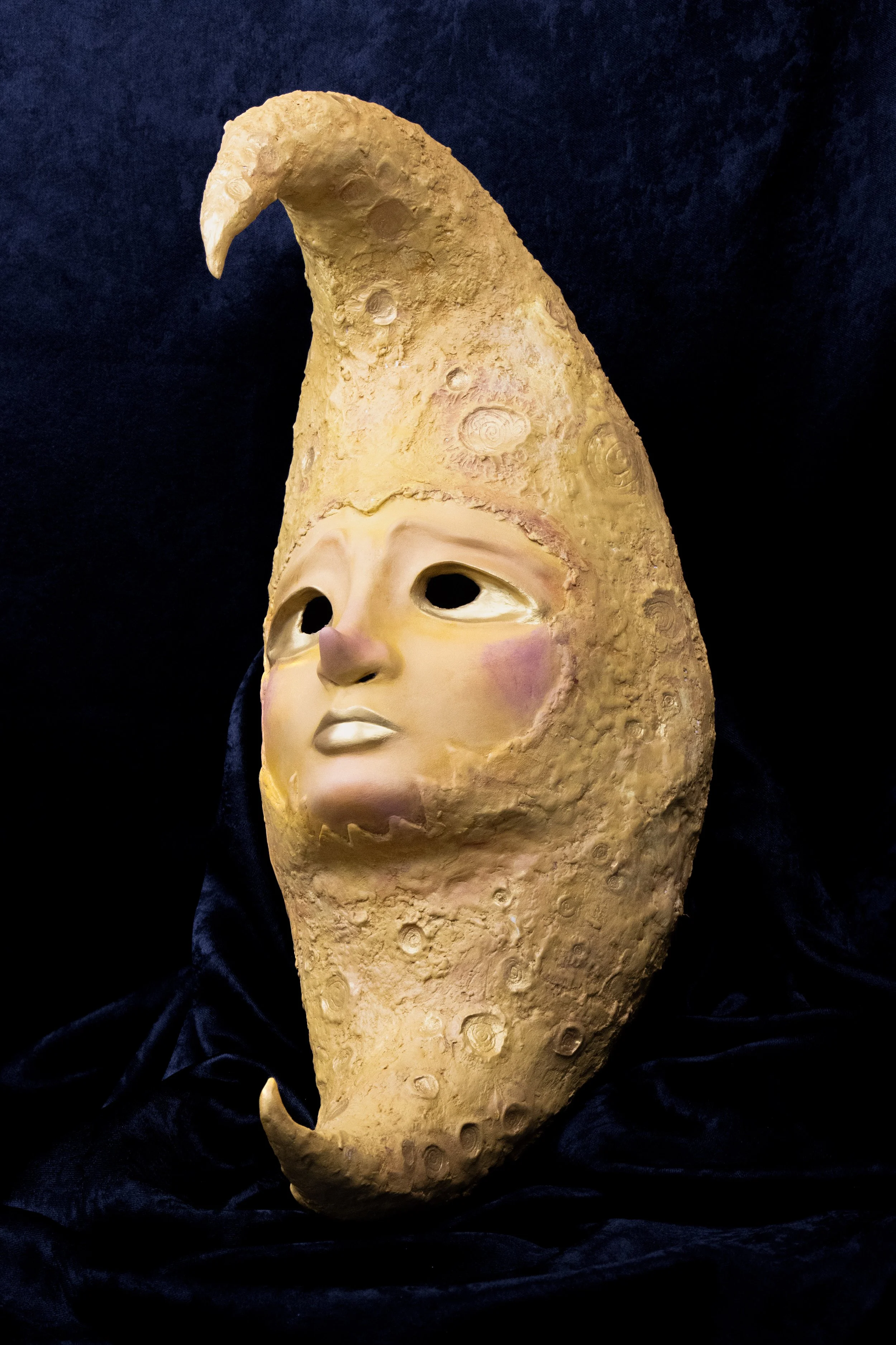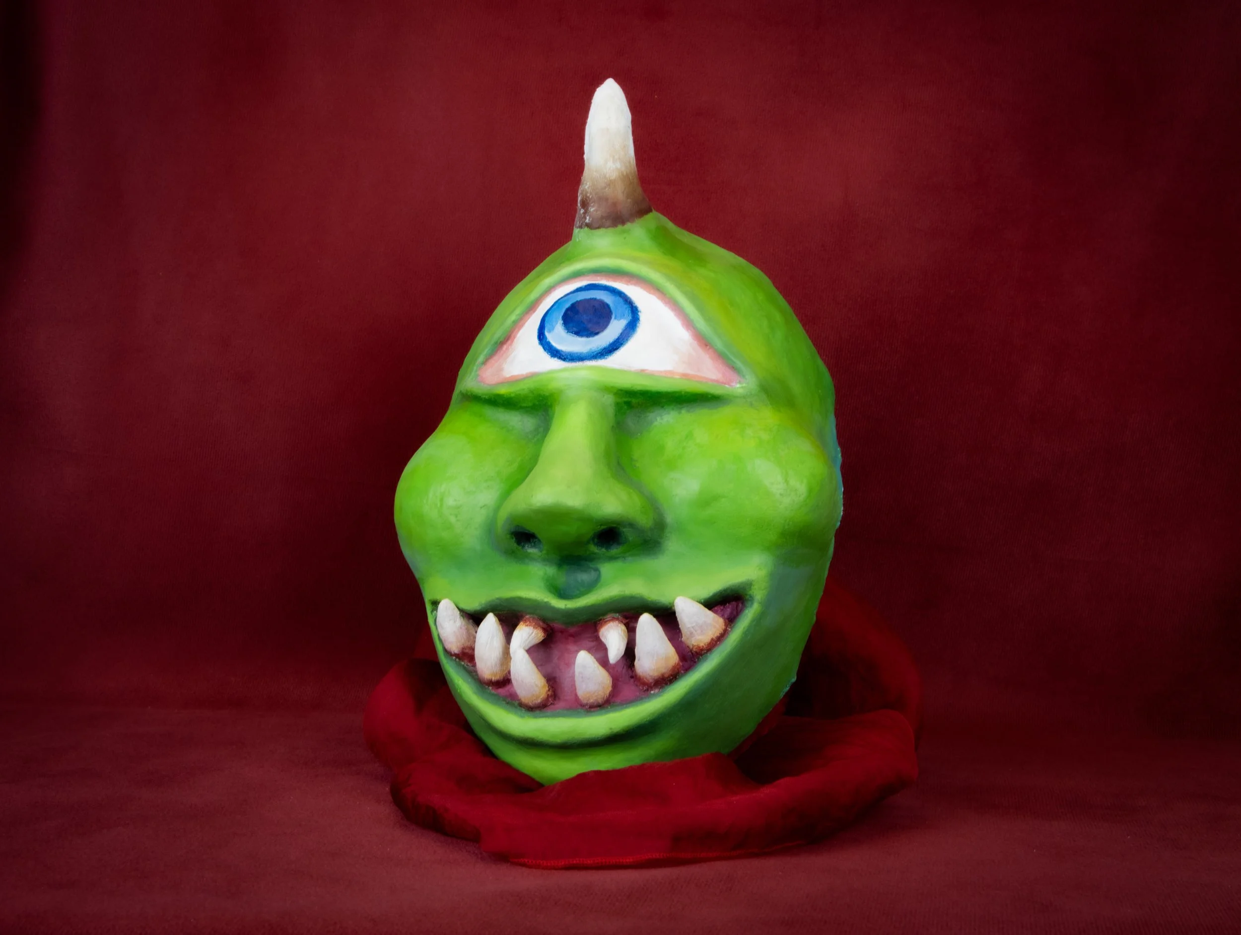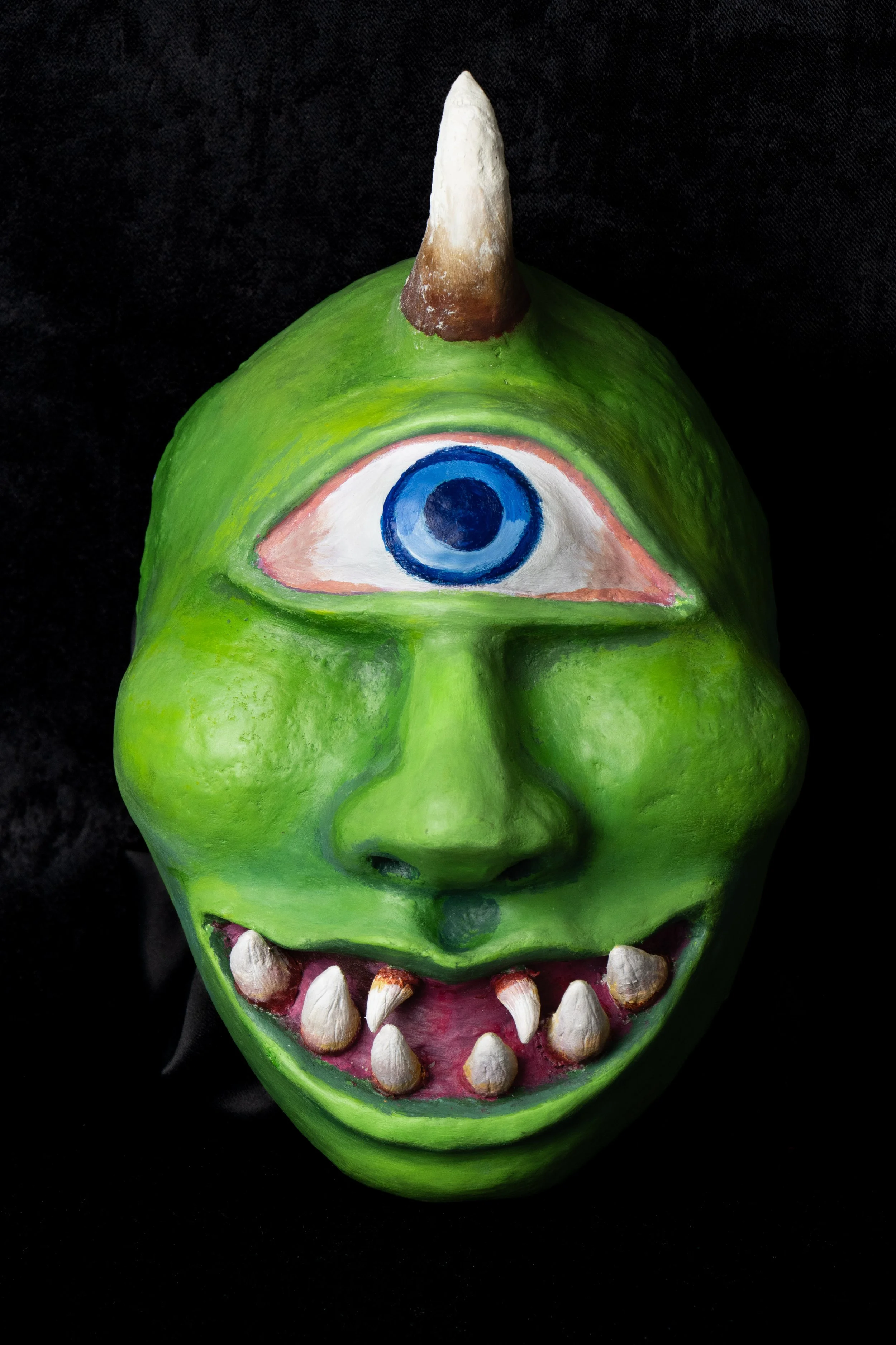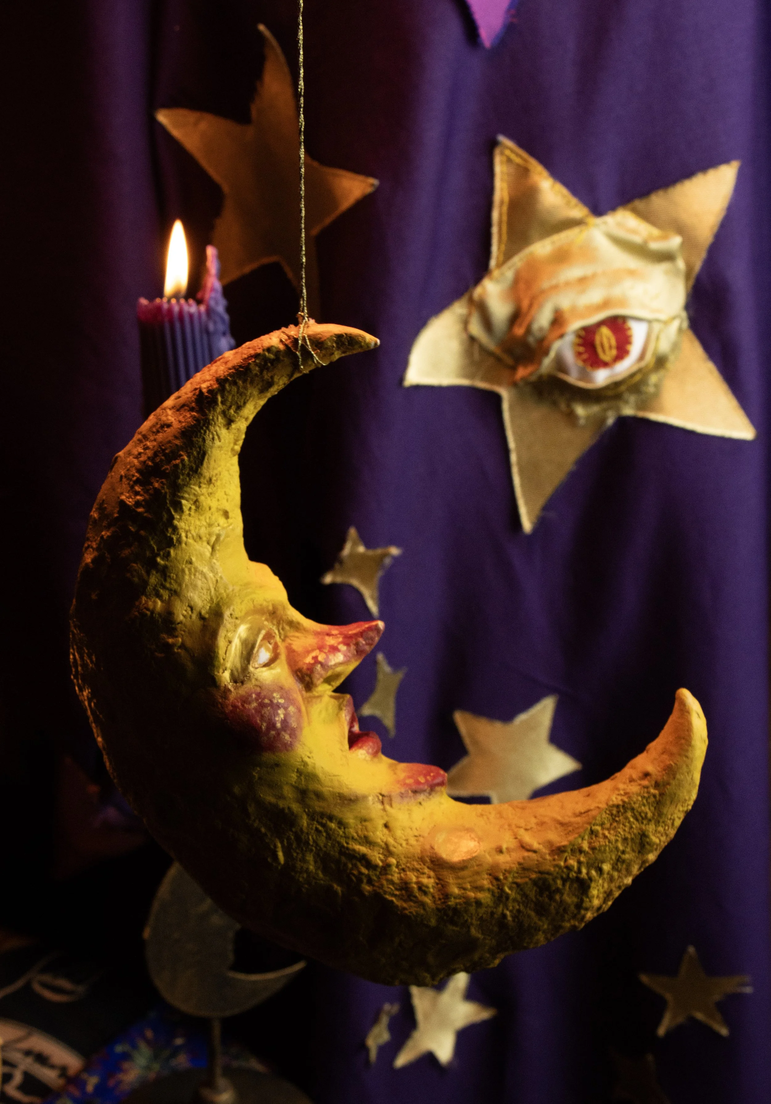 paper mache, paper clay, various textile scraps, hand and machine embroidery, acrylic paint.