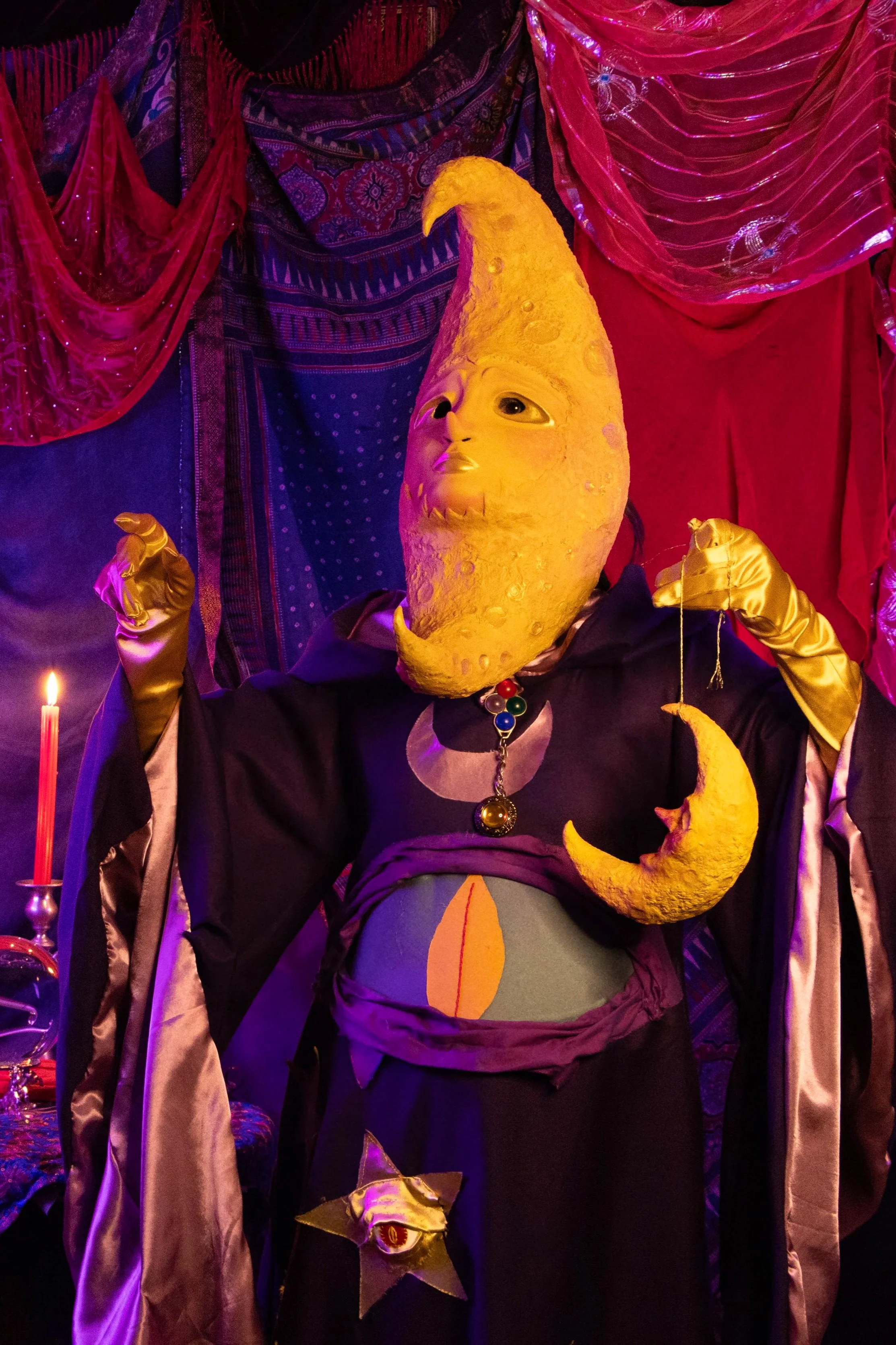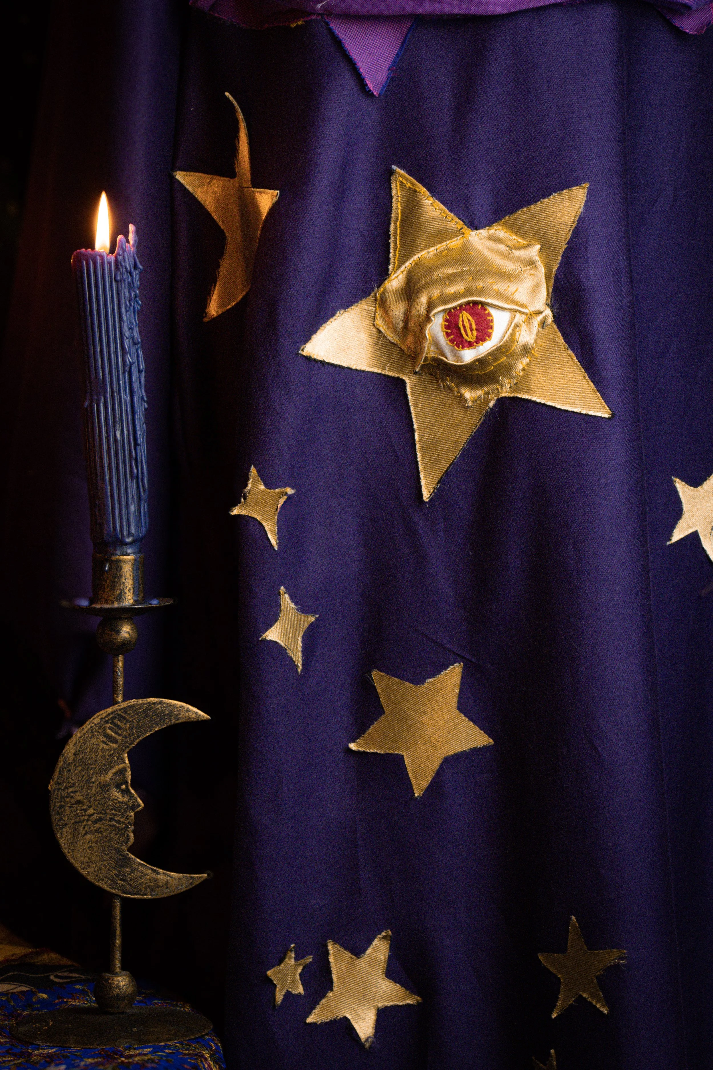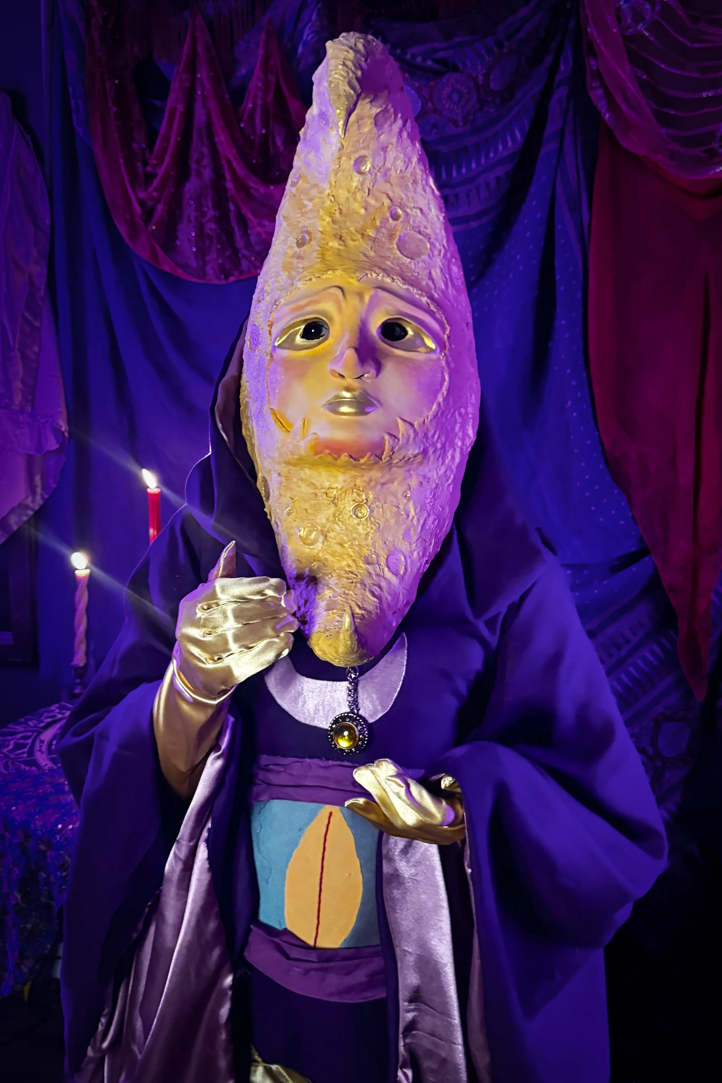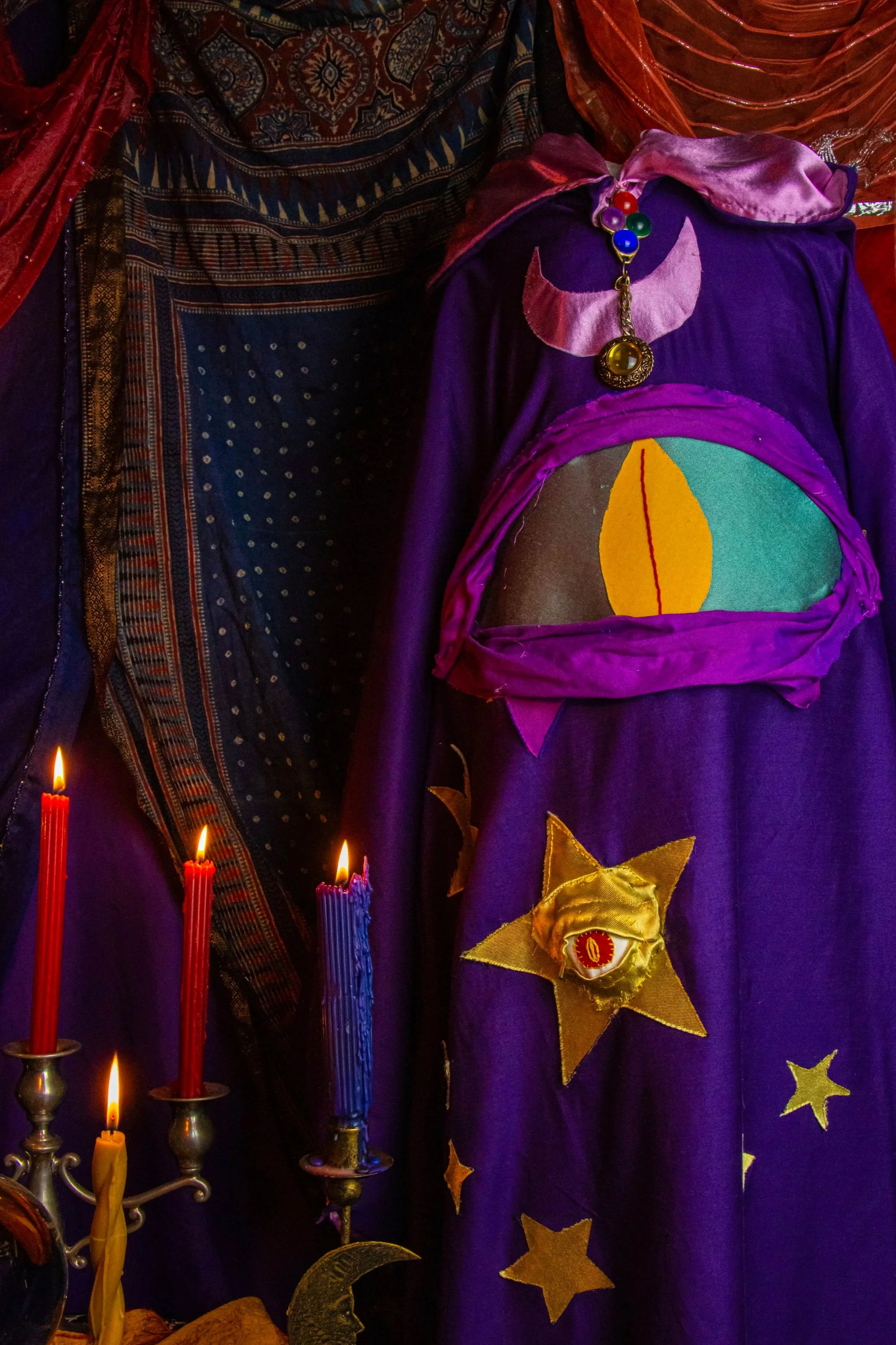 paper mache, paper clay, various textile scraps, hand and machine embroidery, acrylic paint.